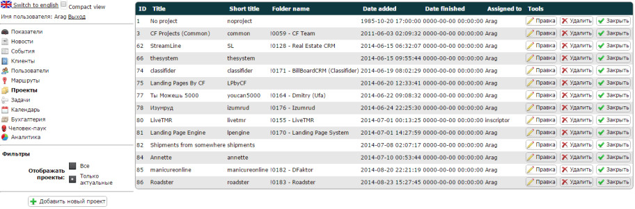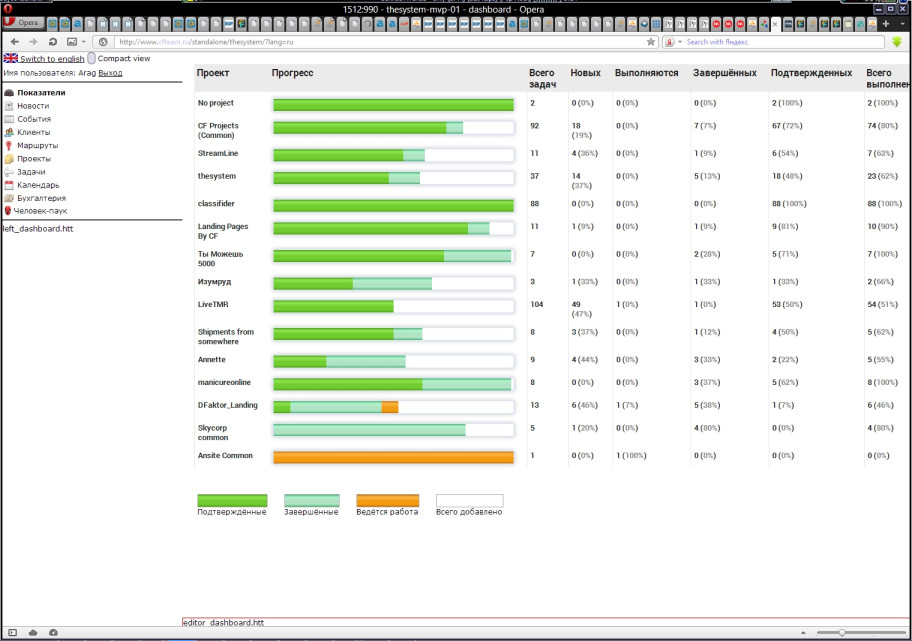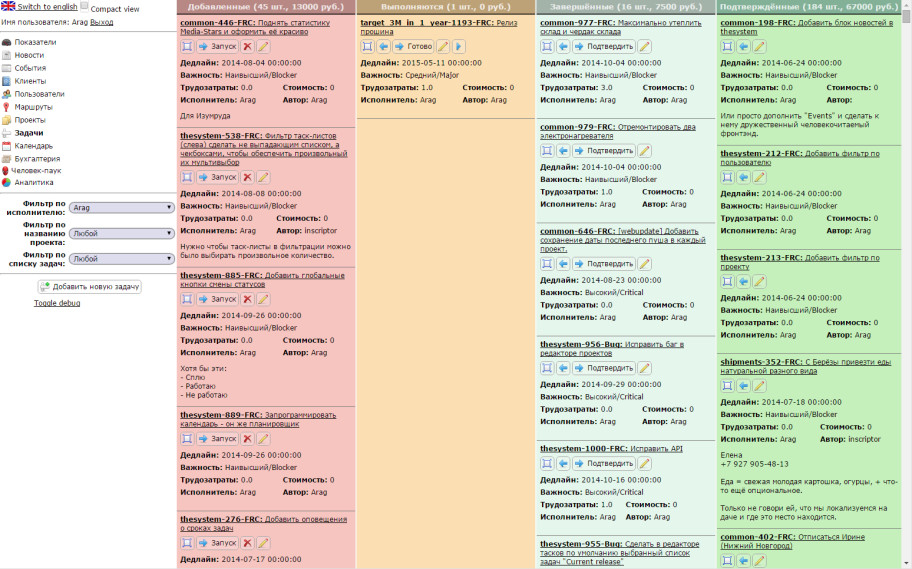 Каждый проект привязан к бухгалтерии, что позволяет отслеживать ход работы по нему как по задачам, так и по финансам. Кроме того, на нашем release candidate-сервере, который находится в локальной сети, есть удобная система навигации по файлам проектов, синхронизировананя с thesystem.