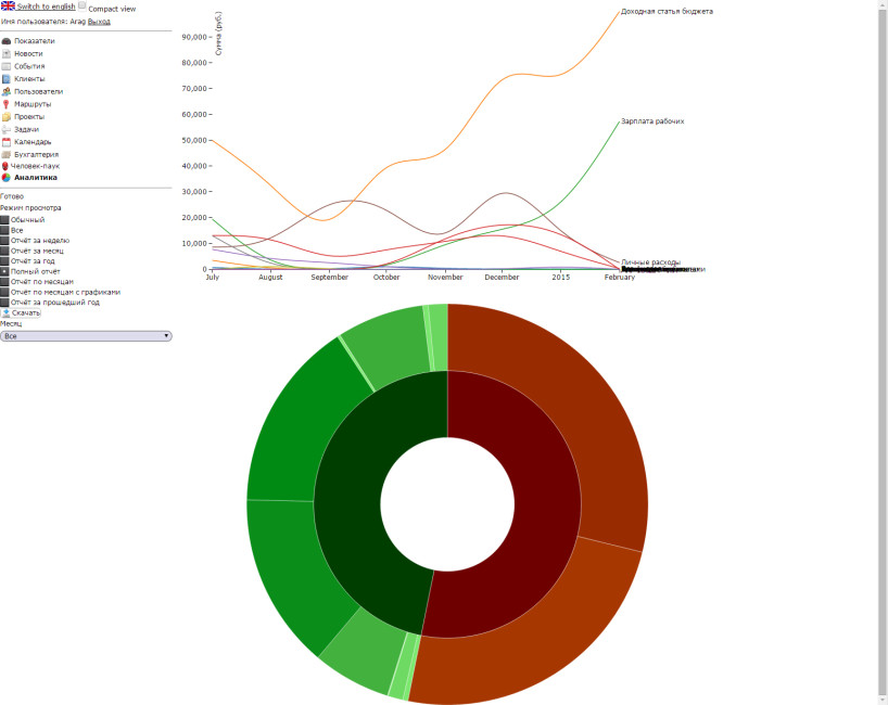 На круговой диаграмме зелёное — расходы, красное — доходы. Сектора круговой диграммы при клике раскрываются, отображая детали по статье, вплоть до транзакций.